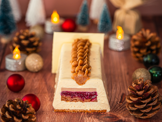 Le cassis apporte une touche fruitée et vive au fondant du marron, adouci par la vanille. Une bûche équilibrée, fraîche et tout en douceur