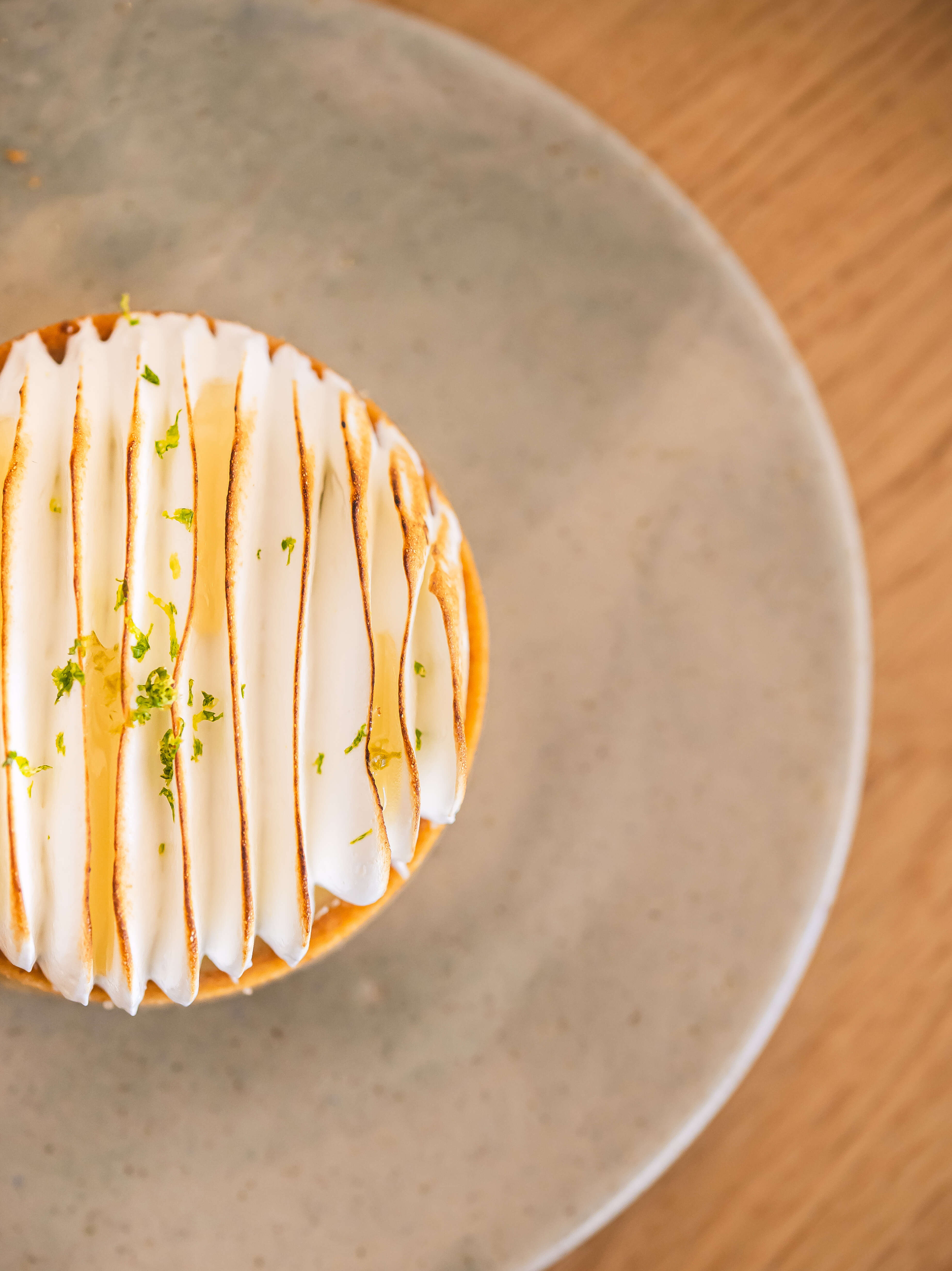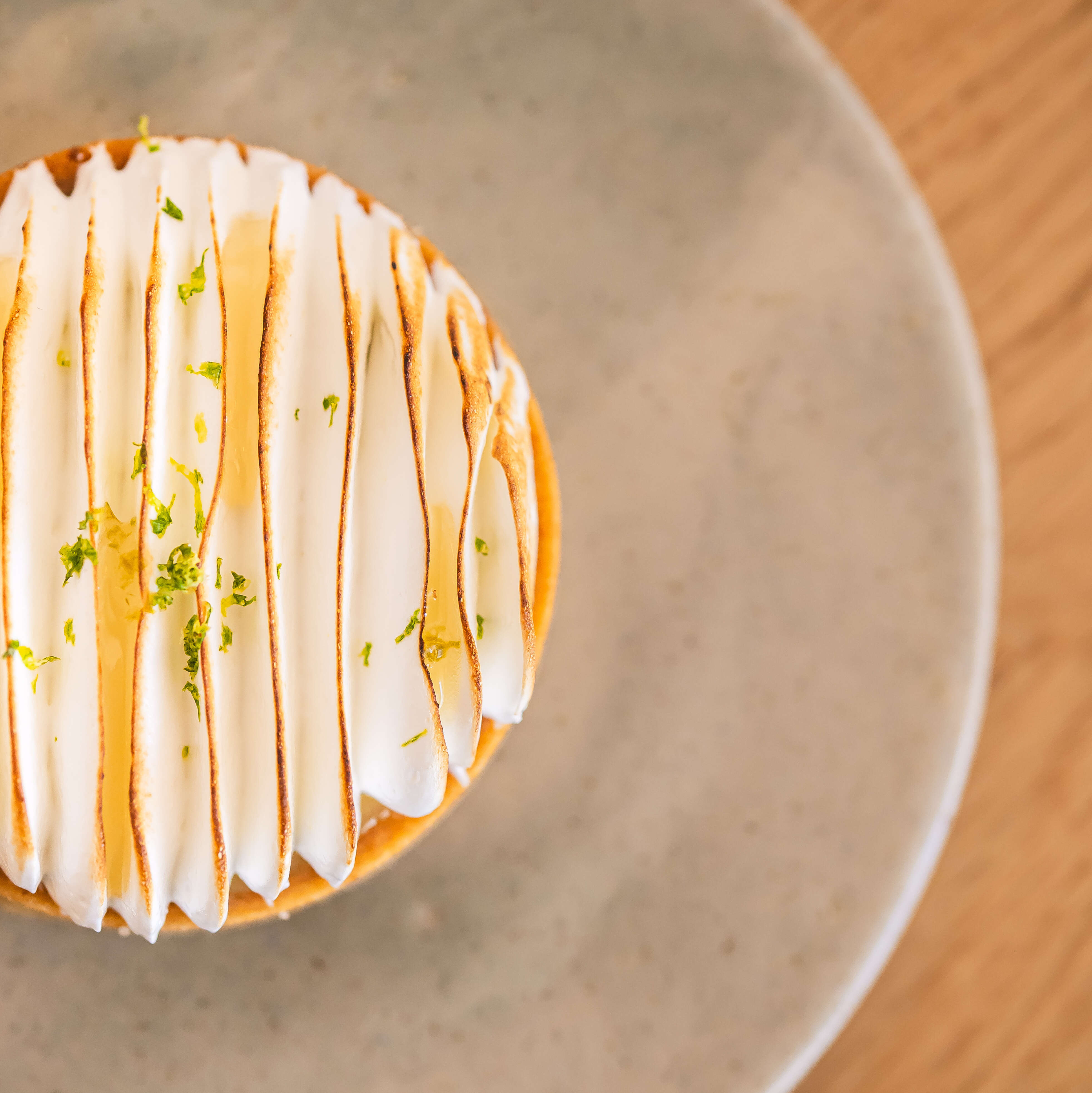 Pâte sablée amandes, praliné noisettes, crémeux citron vert, meringue italienne et gel citron vert.