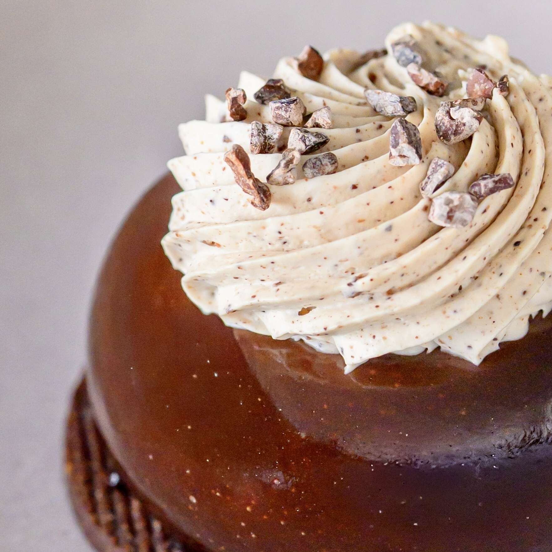 Pâte sucrée cacao, mousse chocolat noir 64%, biscuit cacao, praliné noisettes et grué de cacao et crémeux au gruée de cacao.
